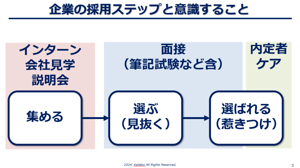 採用活動の流れには「応募者を集める」「見極める」「選ばれる」という3つの段階があり、特に「見極め」と「選ばれる」のバランスが採用において重要になってきます。