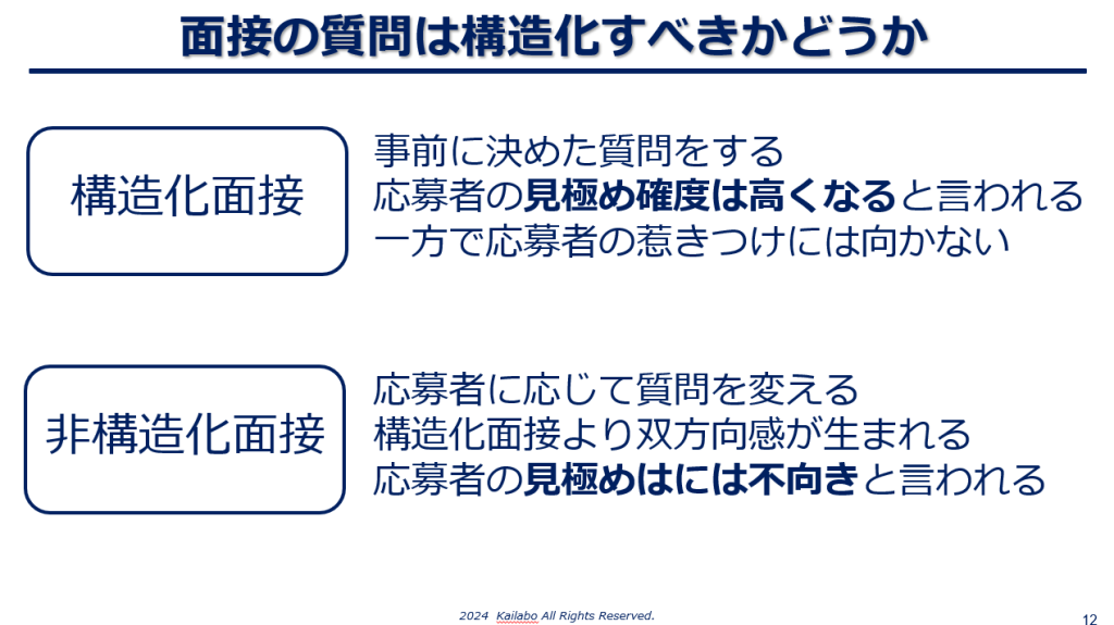 しかし、完全に構造化してしまうと、応募者側から見て「自分に合わせて質問をしてくれない」「自分を見てくれていない」と感じるため、「引きつけ」(選ばれる)効果が低下し、逆効果となります。