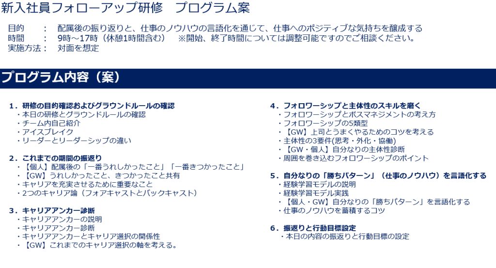 新入社員フォローアップ研修の目的は、入社後の振り返りを通じて自分の価値観や思考のクセに気付くとともに、今後のキャリアイメージを具体化して仕事に主体的に取り組めるようになることです。