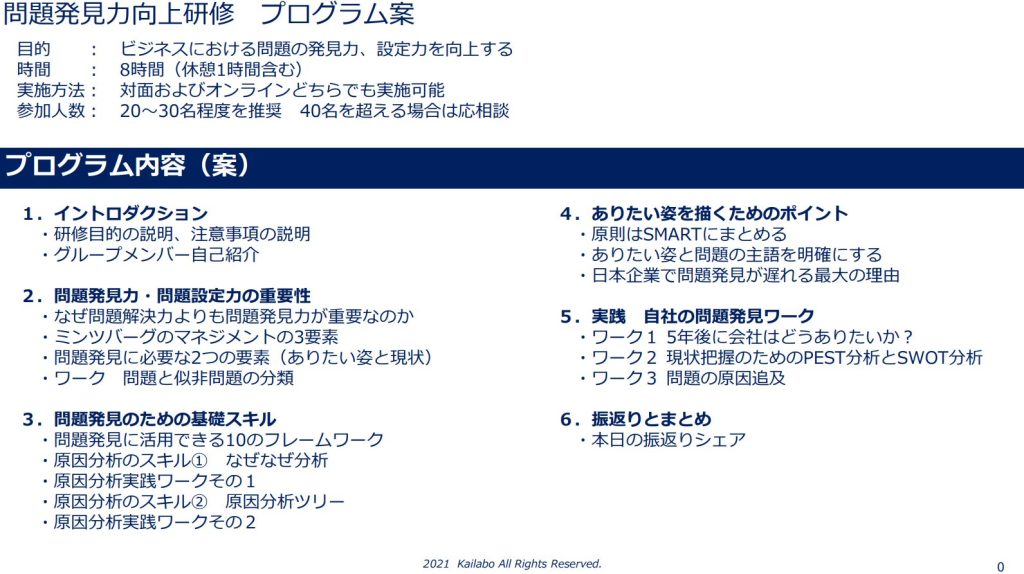 株式会社カイラボでは企業の人材育成支援として様々な研修をご提供しています。本レポートでは2024年10月10日にご提供した「問題発見力向上研修」の様子をご紹介します。