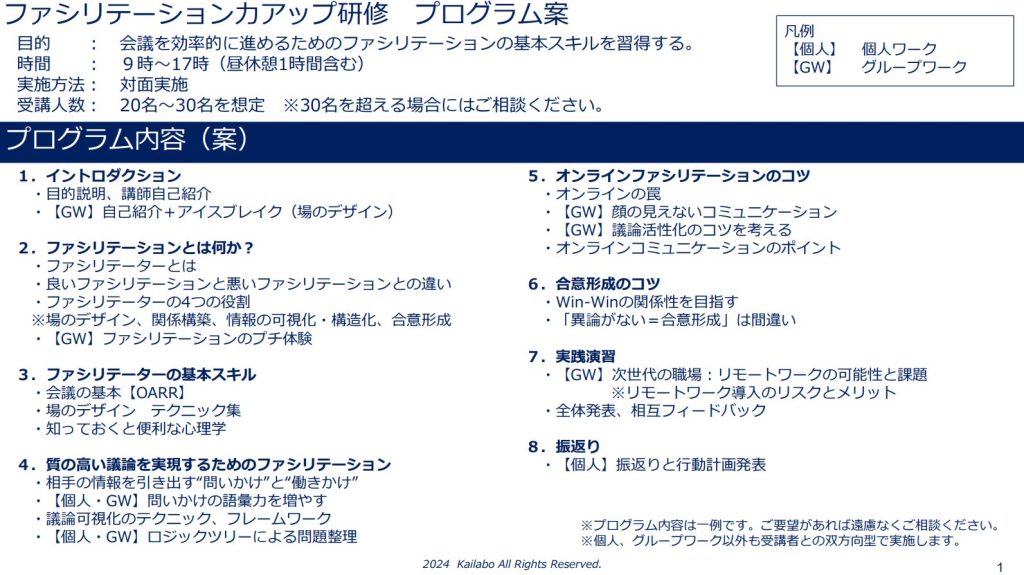 また、昨今ではオンラインミーティングの会社も増えています。今回のお客様もITの企業であり、オンラインミーティングが多いため、『オンラインでの合意形成』というカリキュラムを追加しました。