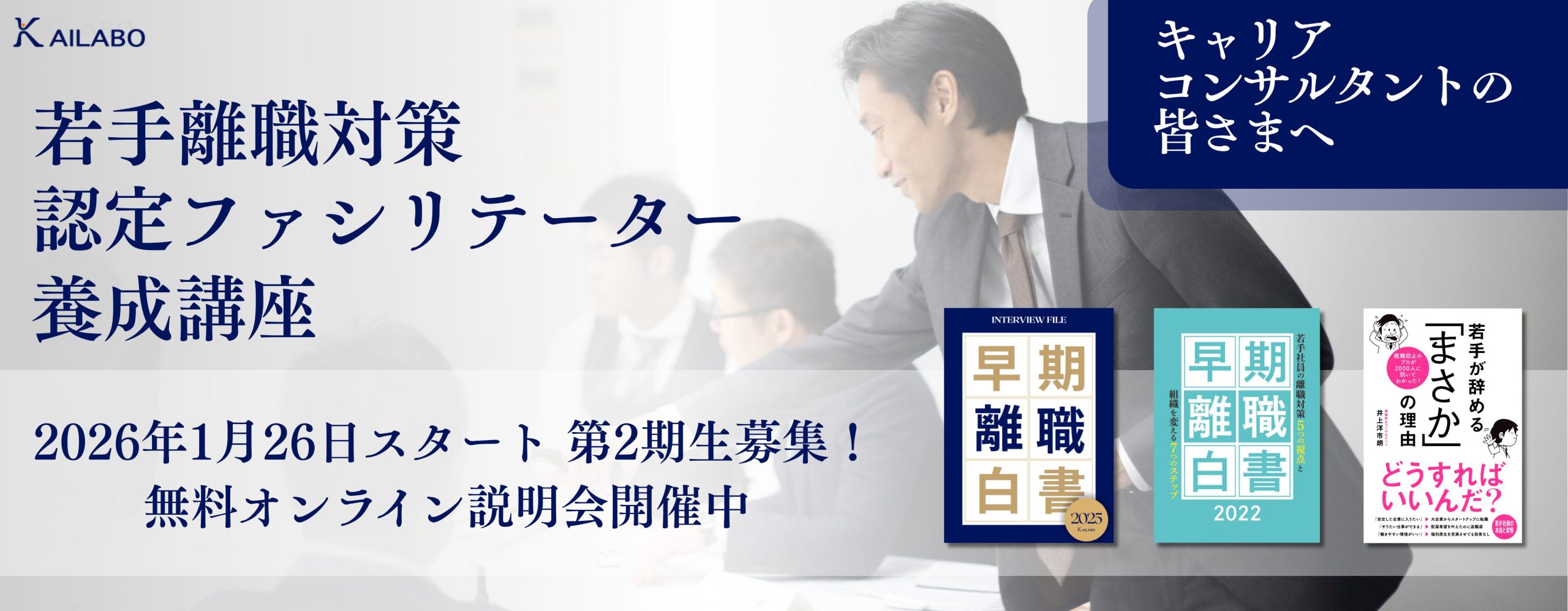 様々なかたちで組織や個人をサポートしている皆様の活動に、注目度の高い取組テーマ「若手の離職対策」を加えませんか。